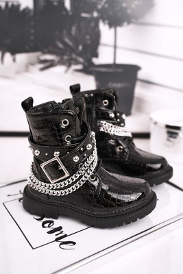 Dziecięce Botki Z Łańcuchem Ocieplone Futerkiem Lakierowane Czarne Dolly